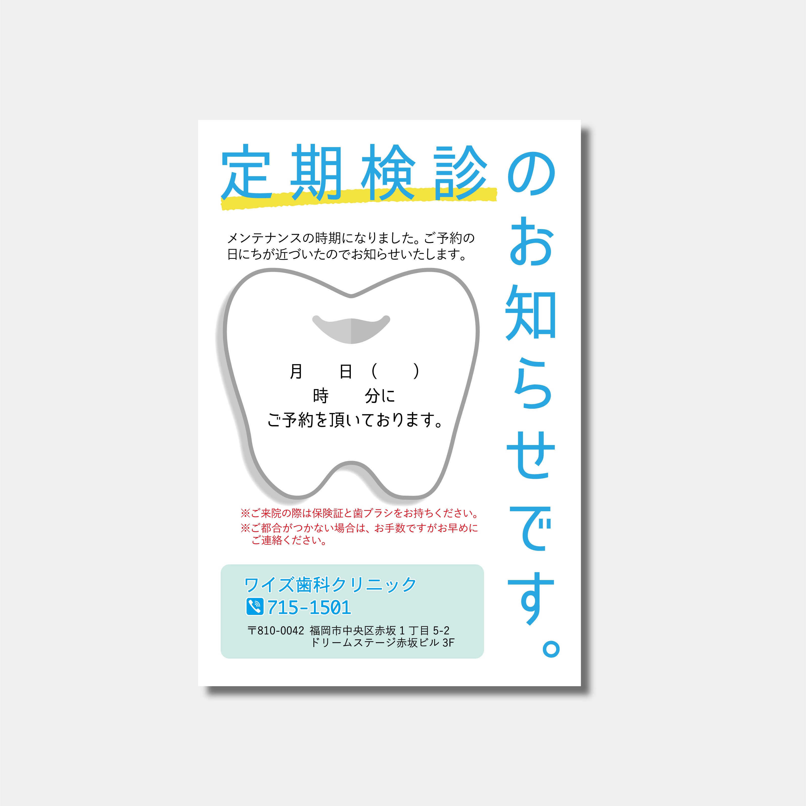 「定期検診のお知らせです。」と大きめの文字と、大きな歯のモチーフのみを置いた、シンプルなデザインです。