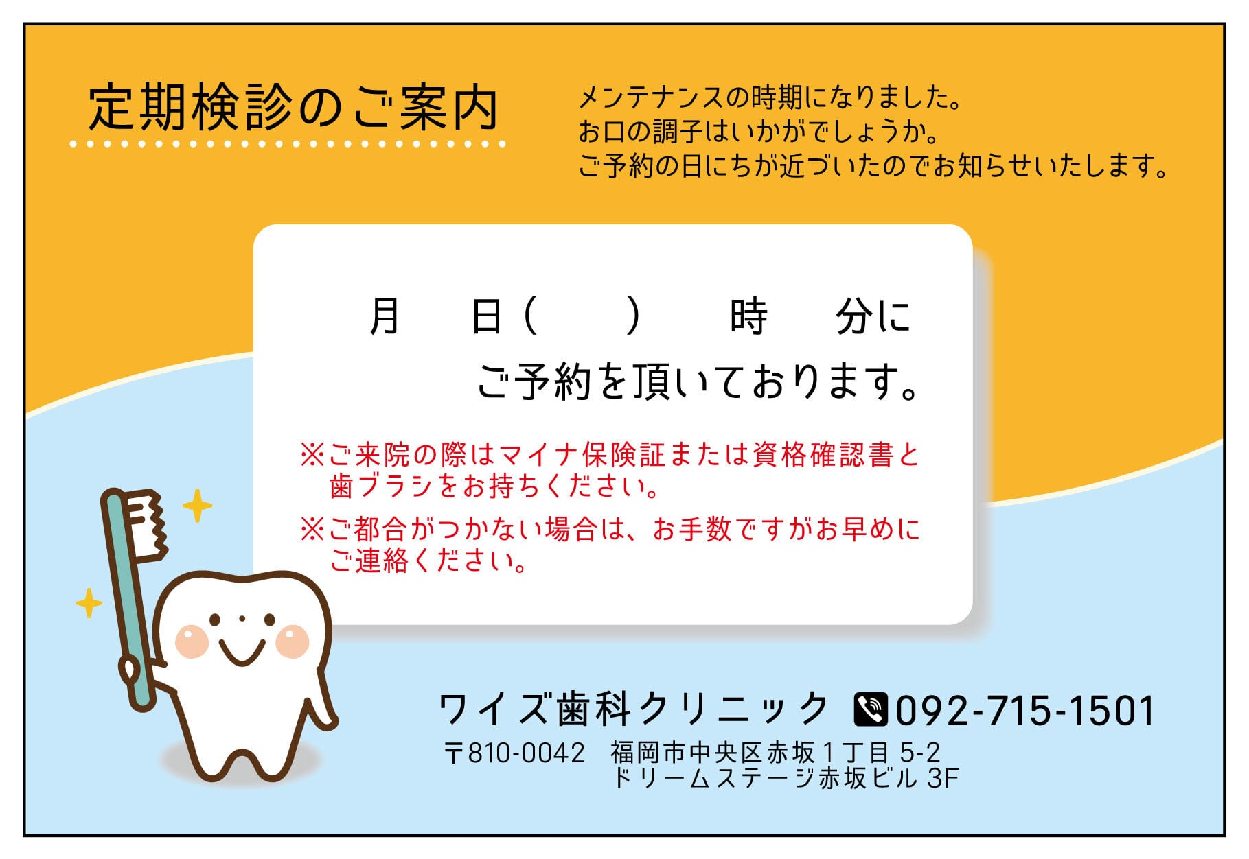 すでに次回の定期検診のご予約が入っている患者様へ日時をお知らせするものです。