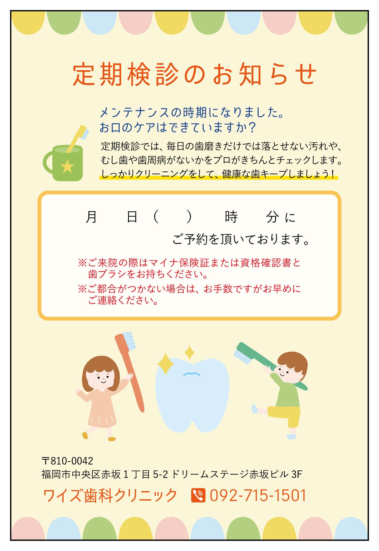 すでに次回の定期検診のご予約が入っている患者様へ日時をお知らせするものです。