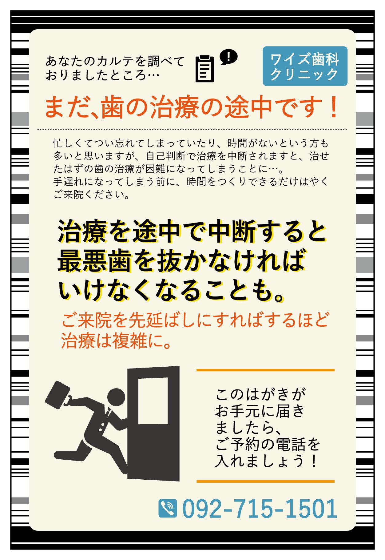 治療を中断してしまい、悪いところをそのままにしている患者様へ受診を促すものです。