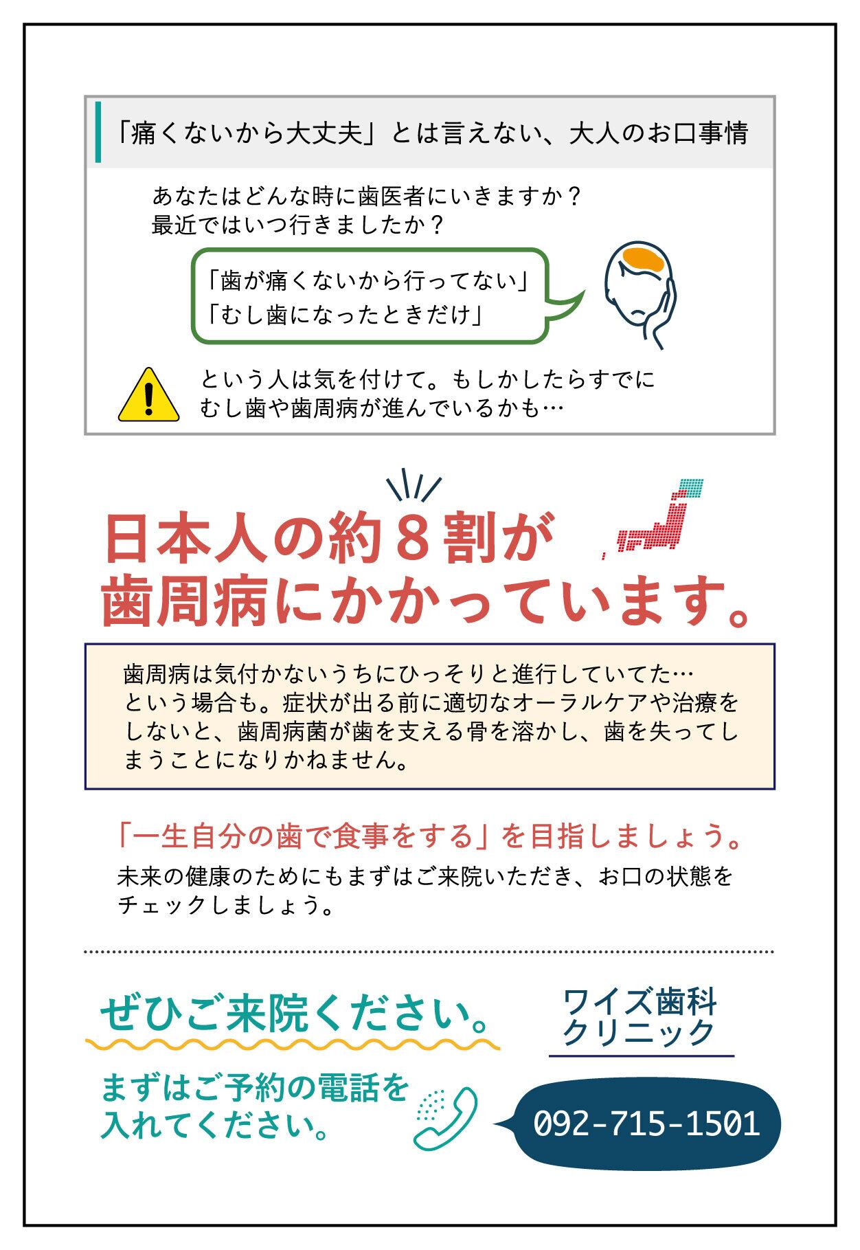 数字を目立たせるデザインや日本列島のイラストで、まるで自分も歯周病の症状の一人なのかもしれないという気づきだけではなく、不安にする気持ちにします。自分は大丈夫と思っている方が、自分も一度歯科医院できちんと診てもらおうという気持ちから来院へ繋げます。