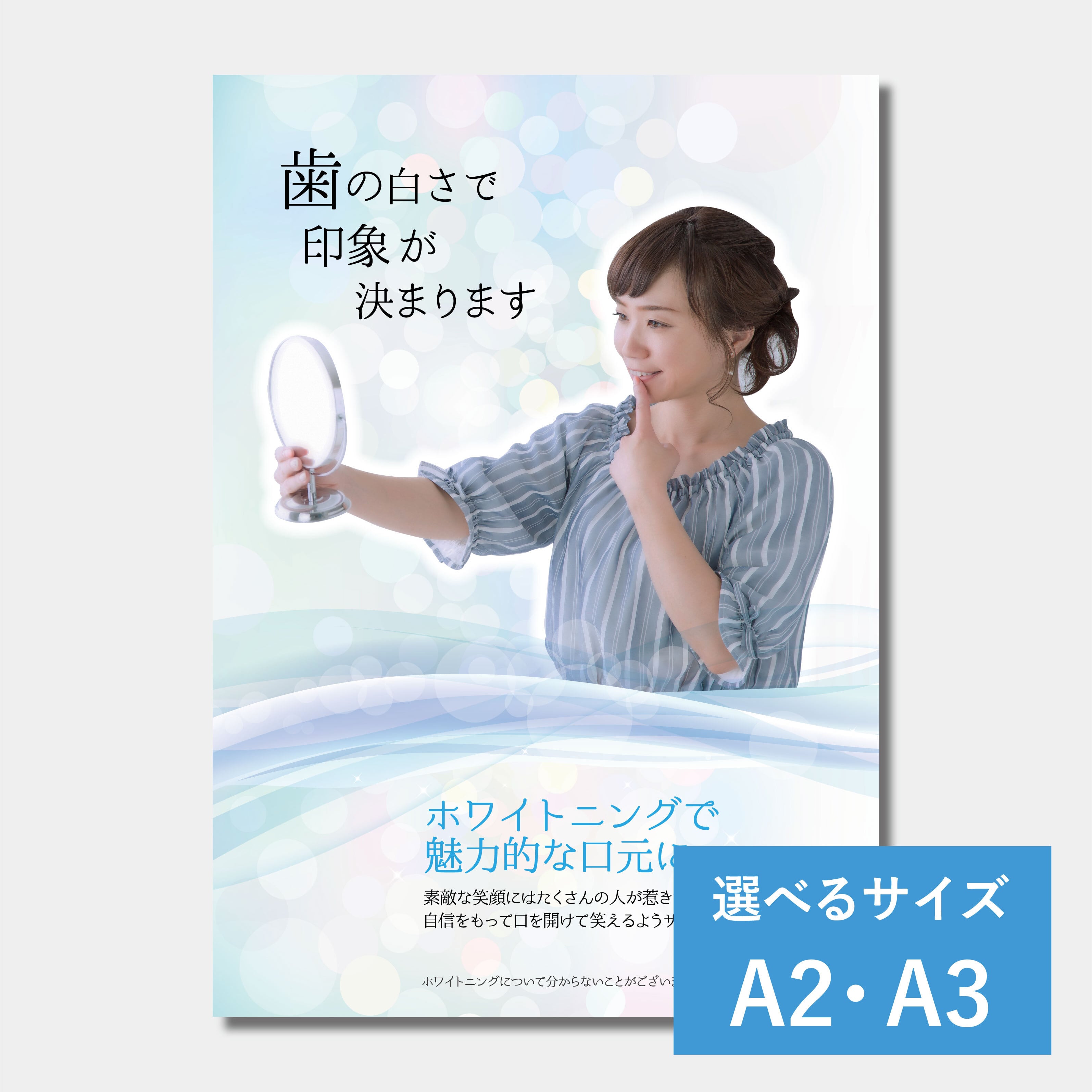 ホワイトニングのPRポスターです。 背景を審美性を感じさせるデザインにこだわり、歯が白くなり魅力的な口元になることで、自信を持って人と接することができたり、素敵な笑顔に周囲の人が惹きつけられたり良いことがあることを伝わりやすい内容になっています。 【サイズと価格】 A3サイズ 1枚3,850円 A2サイズ 1枚5,500円