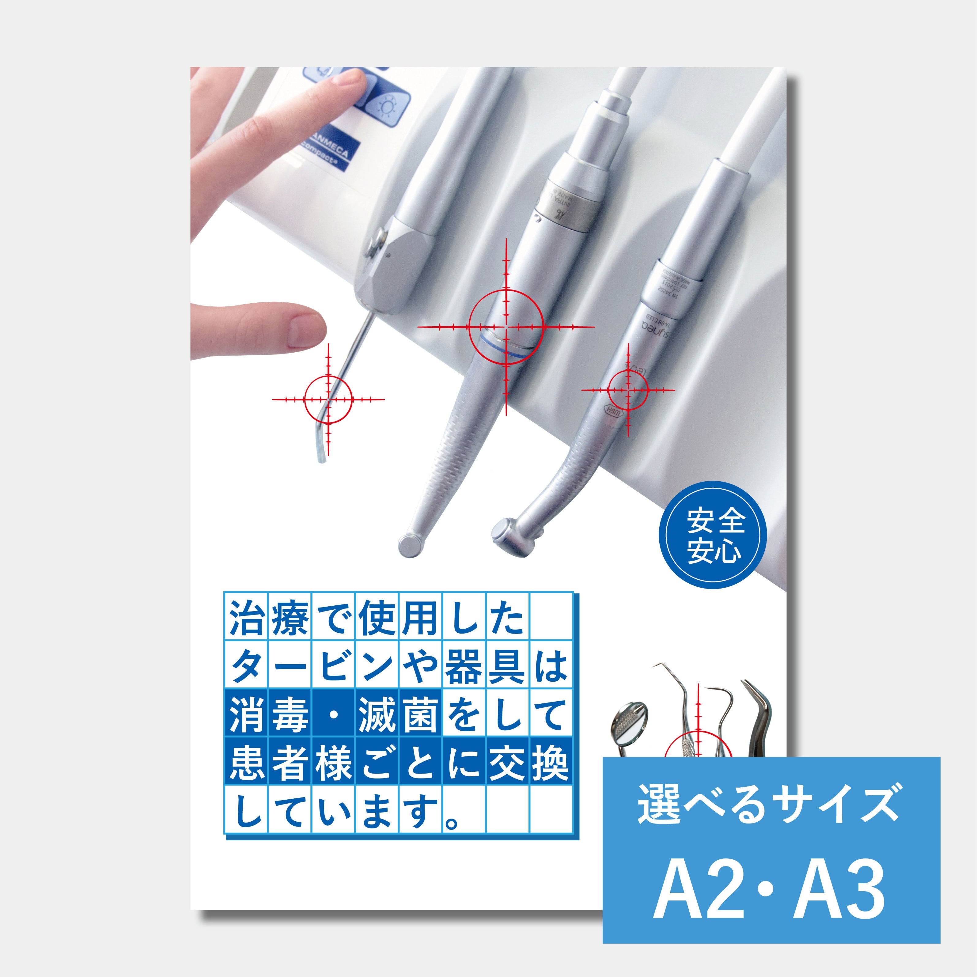 滅菌をしていることで安心安全を伝えるポスターです。 治療器具を患者様ごとに交換しているため安心安全な歯科医院だということを伝えられる内容になっています。器具の場所に目印を付けていて、患者のお口の中に触れる場所や歯科医院側が気を付けているところを伝えることができます。 【サイズと価格】 A3サイズ 1枚3,850円 A2サイズ 1枚5,500円