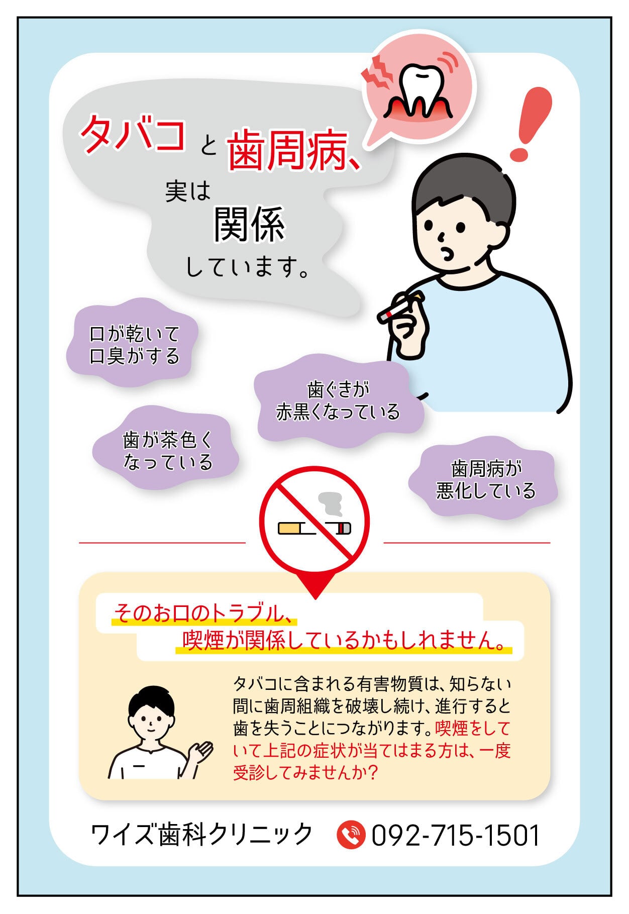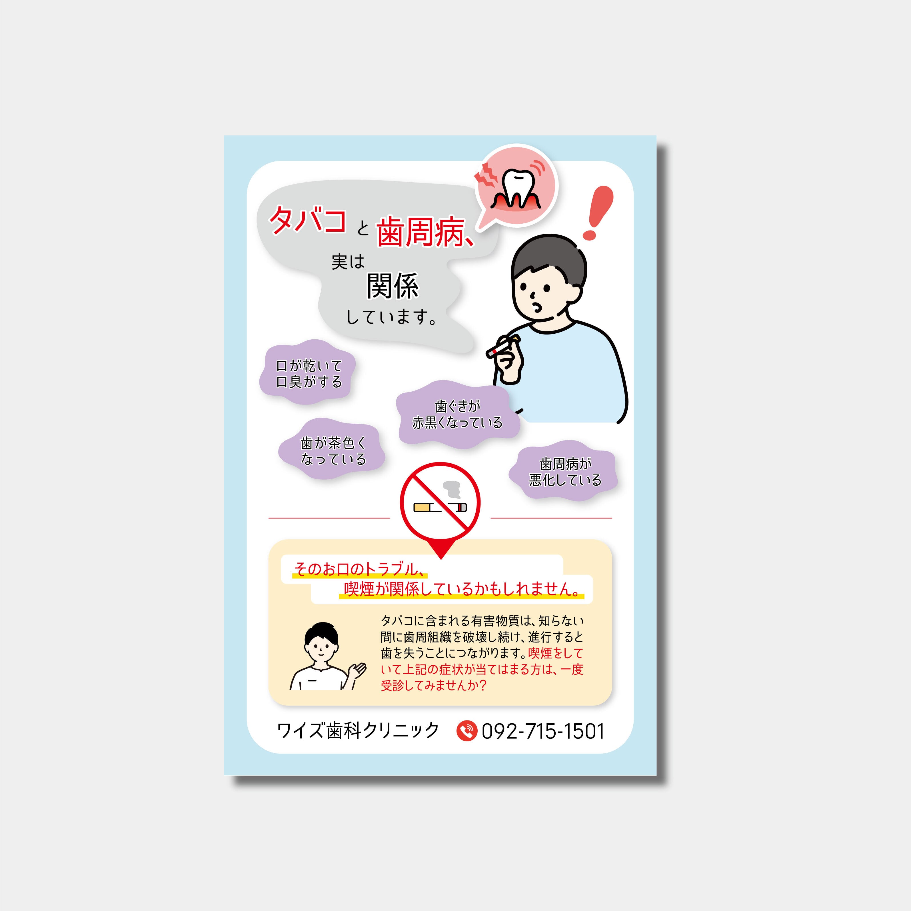 一見無関係そうなタバコと歯周病ですが、お口に関するトラブルの中には喫煙が関係している場合があります。喫煙をしている方がハッとなるような内容で受診を促します。