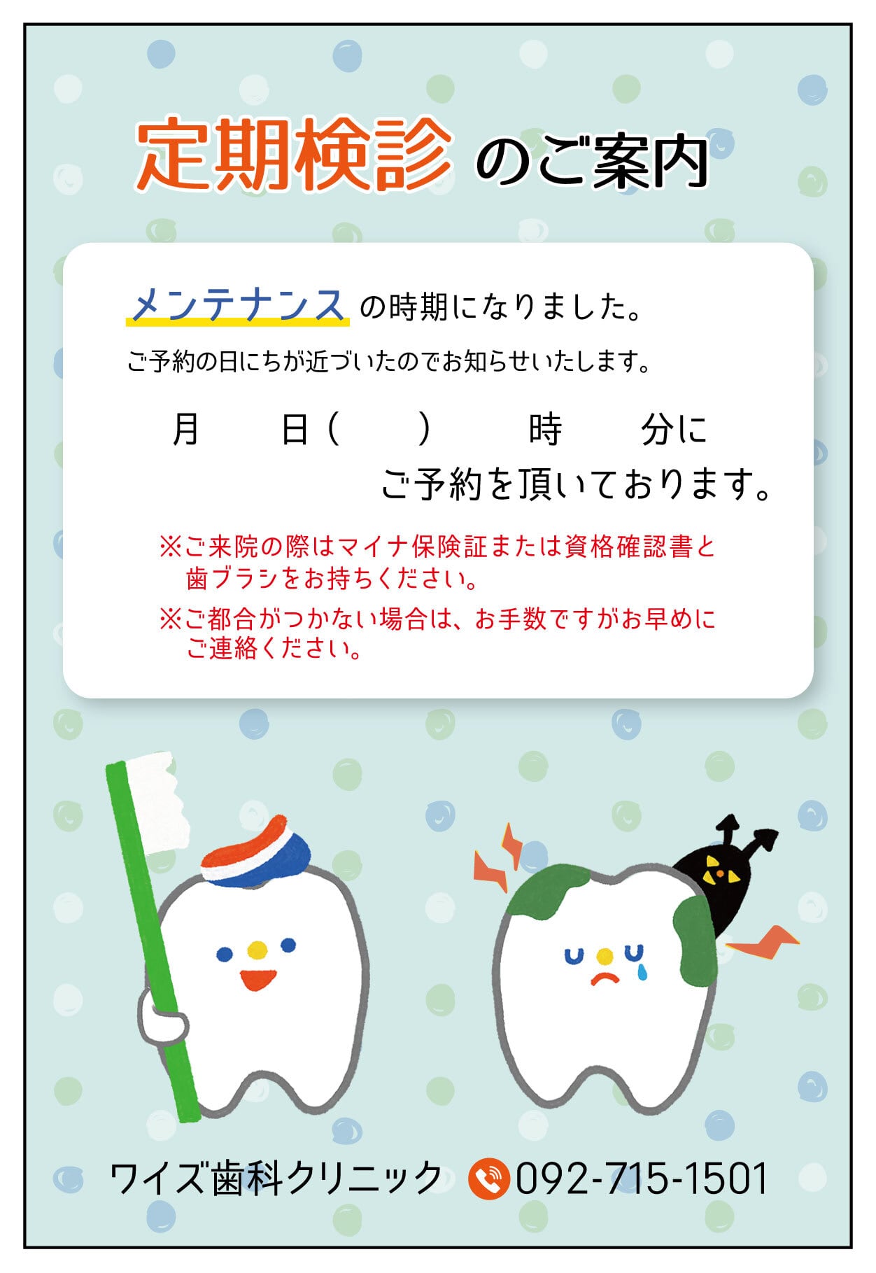 すでに次回の定期検診のご予約が入っている患者様へ日時をお知らせするものです。