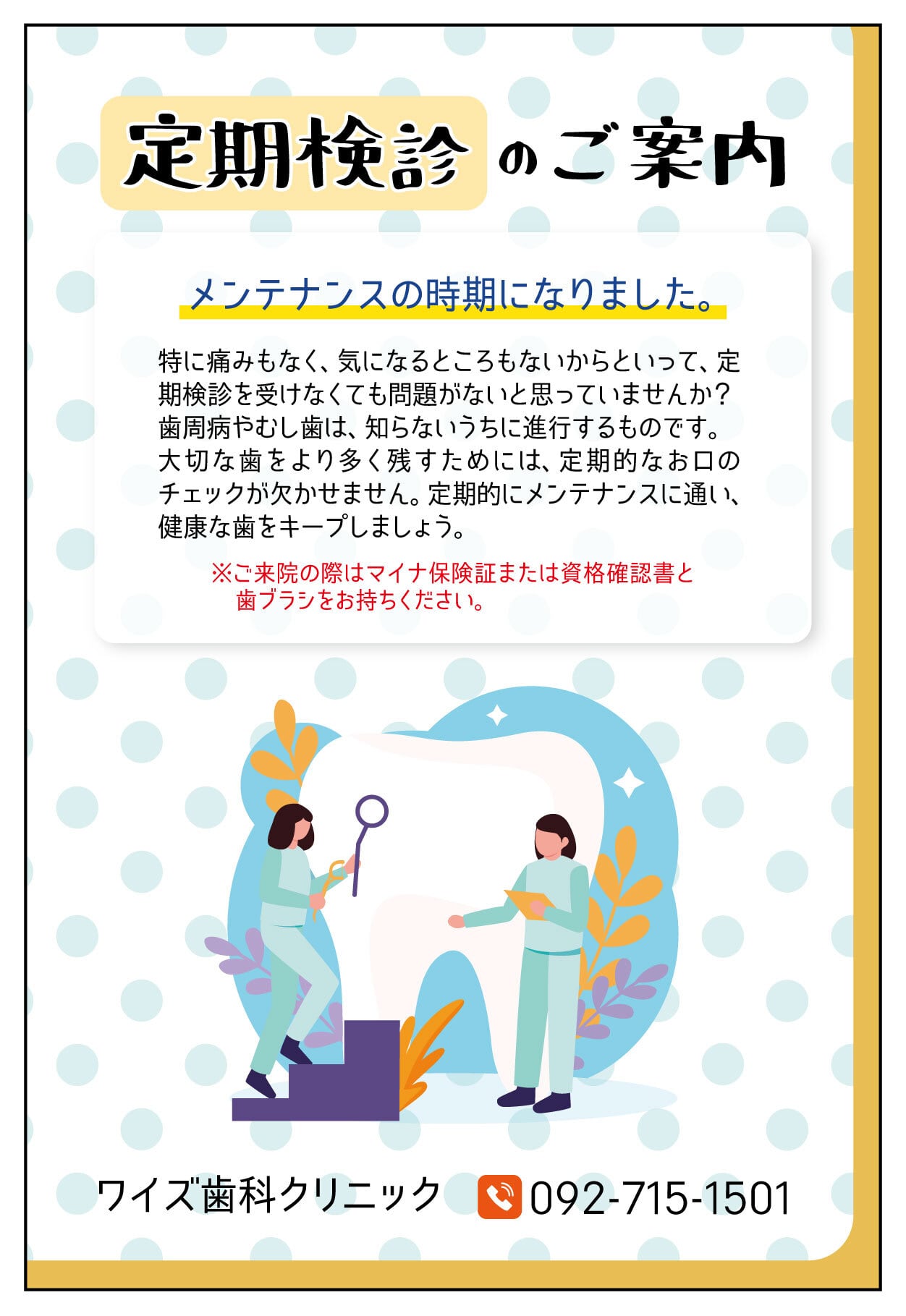 衛生士が歯をチェックしているイラストを配置することで、そろそろ定期検診に行ってみようかな、と思えるような来院を促す一枚になっています。