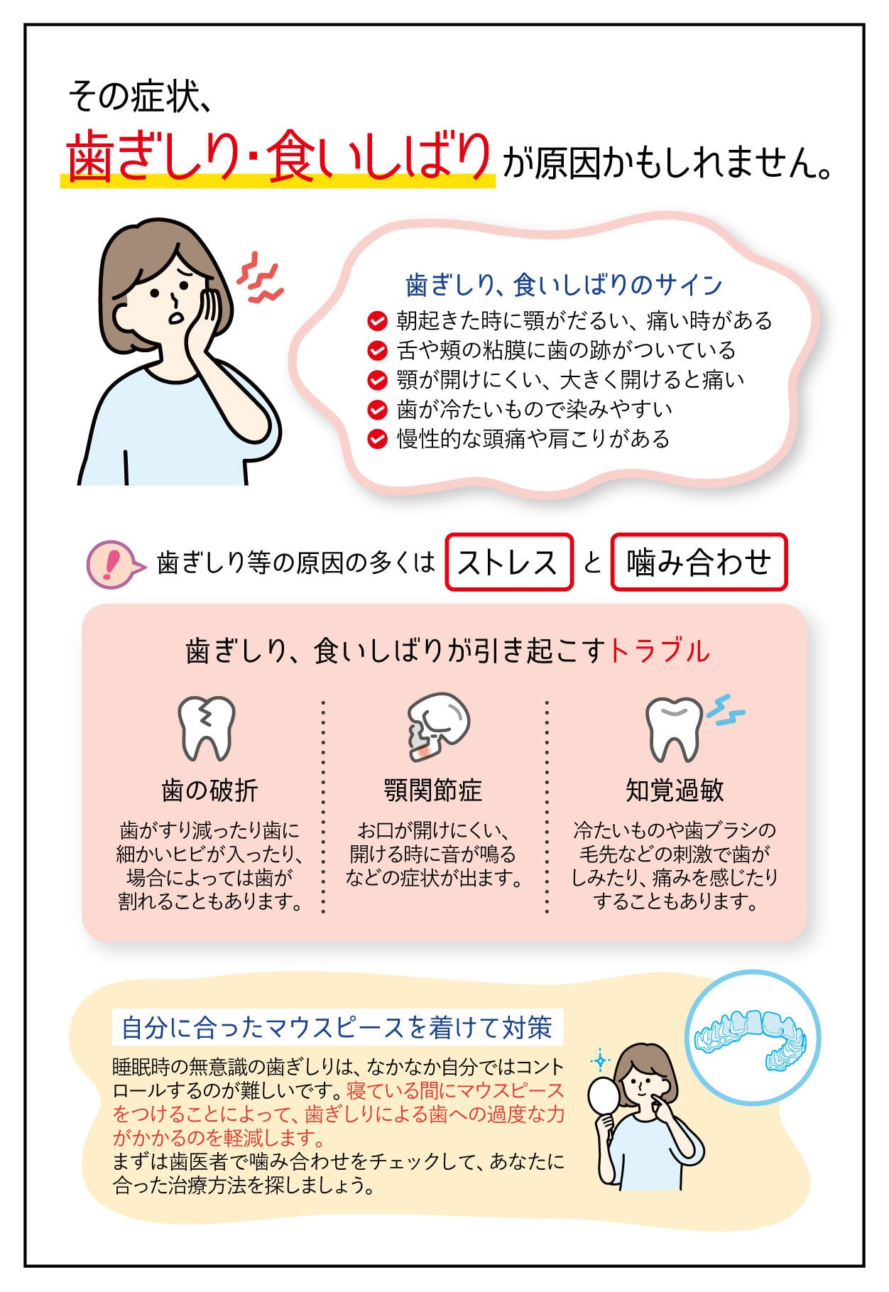 歯ぎしりや食いしばりは放置していると歯や骨に強い力が掛かり、お口回りのトラブルにつながります。改善のためにまずは歯医者に行って根本的な解決策や治療方法を探していく旨を記載し、こういった症状をお持ちの方の来院を促すような内容になっています。